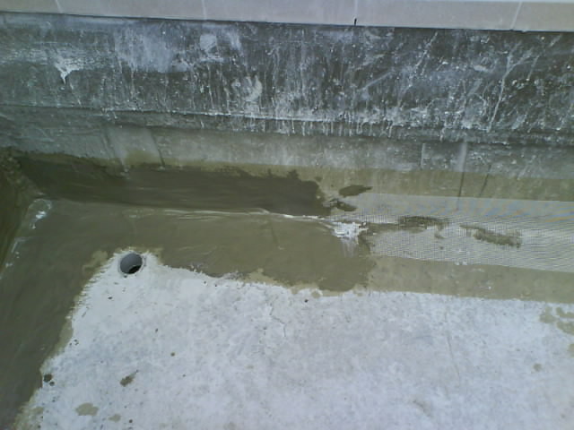 屋頂防水工程 L角鋪設加強網(wǎng)以往屋頂漏水的部位,大部份都發(fā)生在這個L 角和漏水管旁邊,因為L角的女兒墻和地坪不是一體成型有二次的施工接縫,本工法采用海菜水泥膏,在二次接縫部分加強防水層的抗拉性